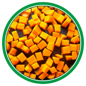 La calabaza se presenta pelada. Utilizamos siempre la parte carnosa y de un intenso color naranja para cortarla en trozos o dados.